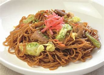 Yakisoba is fried Chinese noodles with meat such as pork, cabbage, carrots, onions, and vegetables such as bean sprouts.